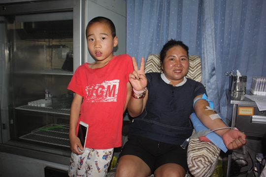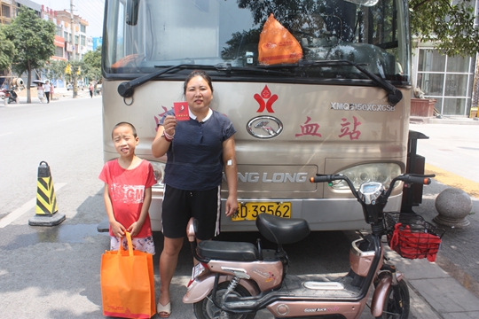 也许是没有休息好,门宾香带儿子来县城中心广场献血点好几次,都因转氨酶偏高没有献成血。但她没有放弃,依然做好进城献血的准备,这次虽遇高温天气,但成功献血,心里还是蛮高兴的。