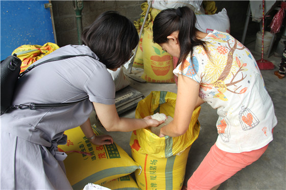 7月26日一早,在王宗任家中,扶贫工作小组、省卫生计生委驻村第一书记吴宝明与王宗任妻子孙林丹一同查看了收获的稻谷,孙大姐高兴地对工作人员们说:“这次收获的稻谷品相非常好,煮出来的米饭很可口,希望血液中心的同志们都能喜欢吃”。随后,扶贫小组工作人员与孙大姐一同将稻谷运送到加工处进行碾制。