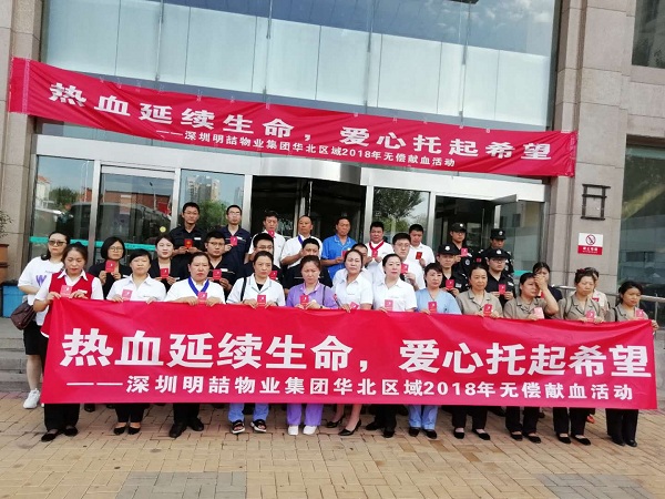 明喆物业是一家具有国家一级物管资质,并设有三十多家分公司的物业管理集团。公司负责人非常注重企业文化建设,已经连续5年定期组织员工参加无偿献血,组织无偿献血也已经成为作为教育职员、树立企业形象、践行社会责任的一种方式。