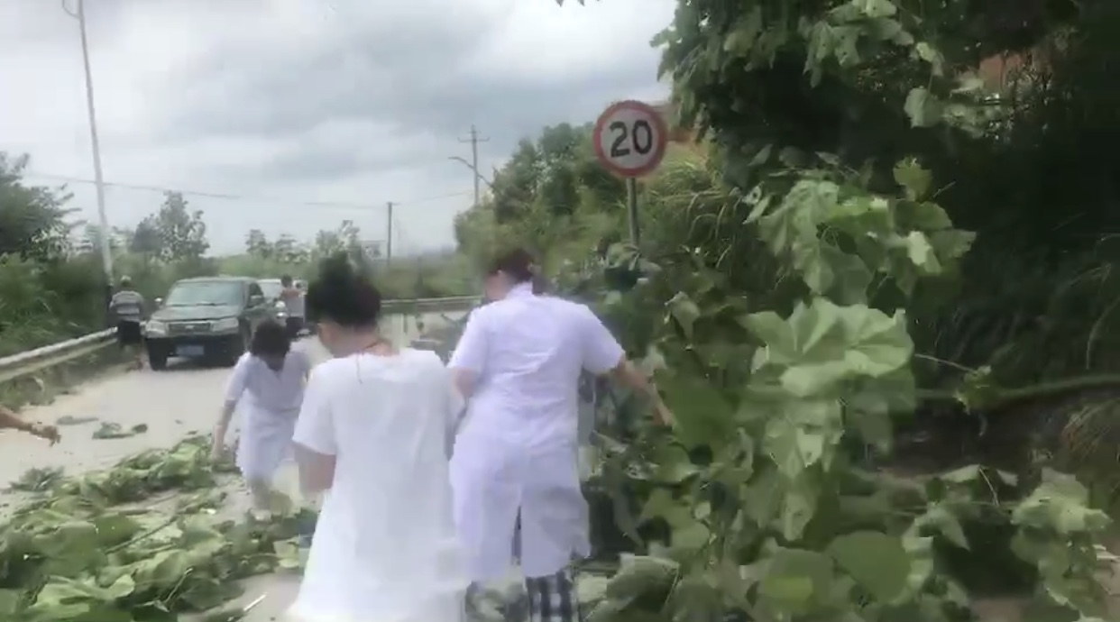 从护士陈虹羽拍摄的视频中可以看到,当时正刮着大风,天空布满了乌云,而被大风刮断的树干直接“横躺”在了山路上,旁边还洒落着许多小树枝,约4米宽的道路全部被挡住,来往的车辆无法正常通行。见到此状,司机朱伟平立马下车想办法疏通道路,并带领现场其他的司机和村民一起清理树枝,随车护士陈虹羽、龙灿和邓薇也毫不犹豫地加入到清理队伍中。