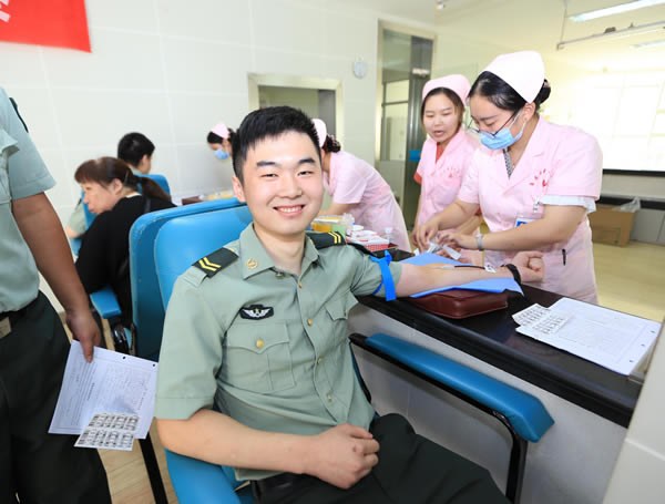 上午8点,前来献血的官兵们早已在二楼的采血大厅里排起了长队。官兵们有序地填写表格、血样采集和无偿献血。看着鲜血缓缓流入采血袋,官兵们脸上露出灿烂的笑容。淮安军分区干休所门诊部主任李健飞说,这是他第八次参加无偿献血。他说:"献血对自己意义很大,好处很多。少量多次不但对自己没有坏处,而且能够促进血液,身体造血功能的更替,促进再生功能。如果我们献血量达到一定量,对我们个人免费用血,家庭成员用血都有直接的利益关系,也就是说对个人对家人对社会都有好处。”淮安军分区班长陈龙说,作为一名军人,淮安是我第二故乡,能为驻地奉献出一片爱心,我感到十分光荣,能用自己的一腔热血,拯救更多的人的生命,我觉得是我们军人义不容辞的责任。”
