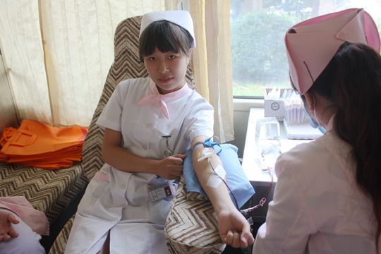 贾艳婷是B型血,望着鲜红的血液缓缓地流进采血袋,她既激动又自豪,作为一位未来的助产师,她在用爱心为生命加油。
