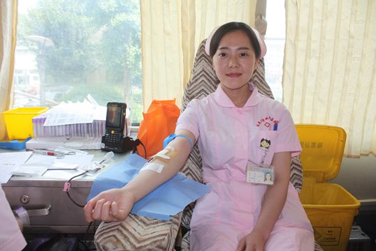 鲜红的血液流进了采血袋,田甜的脸上流露出快乐幸福的微笑,她觉得在这赤日炎炎的暑天,能用热血挽救临床患者的生命,是一件终生难忘的事,将在自己从医的人生路上留下美好的记忆。