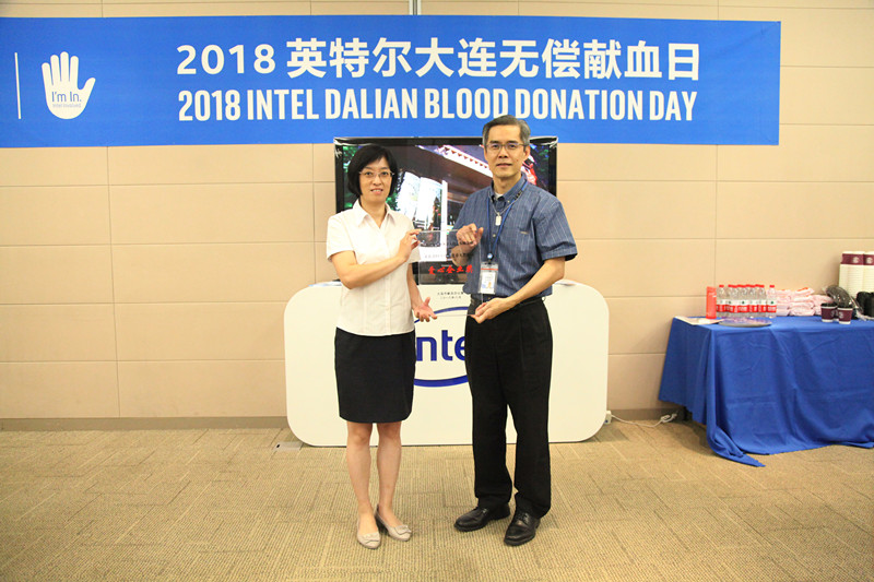 在献血活动现场,大连市血液中心副主任范亚欣向英特尔半导体(大连)有限公司授予“2018年度大连市无偿献血爱心企业奖”,感谢英特尔半导体(大连)有限公司多年来积极参与无偿献血活动。