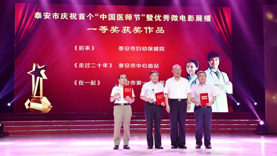 8月16日,泰安市隆重举办庆祝首个“中国医师节”暨全市优秀微电影展播颁奖典礼,泰安市副市长鞠向群,市打私办专职副主任彭恒久,市卫生计生委党委书记、主任刘焕星,大众网泰安频道负责人栾晓磊,市广播电视台总编辑胡开剑出席典礼。来自泰安市各县(市、区)卫生计生局分管领导,省属驻泰各医疗单位、委属各单位党政主要负责人、分管负责人、医务科长、宣传科长、优秀医师代表,委机关副县以上领导、科室负责人等300余人参加典礼。