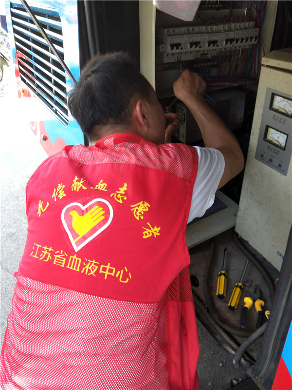 8月8日,烈日炎炎,江苏省血液中心迈皋桥献血车的空调由于超负荷运作闹起了“罢工”。车内温度迅速上升,已开始影响献血环境。采血护士第一时间向总务科反应,进行设备报修登记。但是,维修师傅从站内赶到现场至少要半小时,时间久了不利于血液存贮。在焦灼之际,有过电工经历的志愿者陈时才恰巧过来做志愿服务。他得知缘由后,顾不得休息,立刻进行检查、分析和排障,经过一个小时的处理,接头被烧糊的空气开关才又重新“上岗”。随后,陈时才顺便把相关线路作了进一步梳理。此时,陈时才浑身已被汗水湿透,但他脸上却满是喜悦,还自我打趣说:今天回家后要是用这身衣服烧菜做汤,就压根用不着再放盐了。