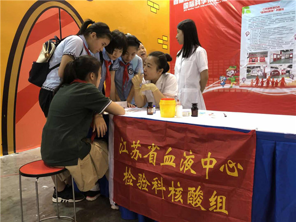 8月21日,首届南京青少年国际科学博览会在南京新庄国际博览中心馆举办。本届博览会由中国科技馆、江苏省科学技术协会、中科院南京分院支持举办,江苏省科学传播中心主办。在本次大会上,江苏省血液中心作为唯一的采供血行业代表参展,向公众科普血液和献血知识,检验科核酸组青年文明号为现场的小朋友们免费测血型,并讲解急救知识。