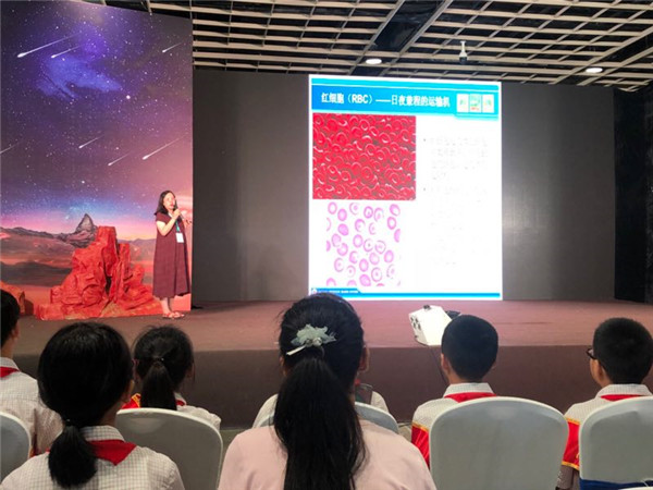 图文并茂的幻灯片和小视频,整齐摆放的桌椅板凳,“血液的奥秘”科普馆讲解员带领小朋友们走进血液知识科普小课堂。血液为什么是红色的?血液里各种主要成分的功能是什么?血型的分类、血管的长度、无偿献血的意义等有趣的血液小知识大家一起学习和分享。现场的“好奇宝贝”们面带微笑,眼睛里闪烁着求知的光芒,还提出各种自己想了解的问题和工作人员进行探讨、交流。