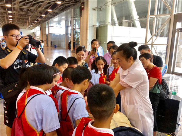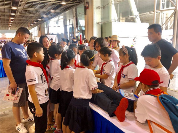 小朋友对现场摆放的假人也充满好奇,试探着摸摸他的衣服,拉拉他的手臂。“青年文明号”的陈慧老师主要针对心脏骤停和暑期儿童溺水急救等突发情况及应对措施进行讲解,并现场演示了心肺复苏术。家长和小朋友们对这样实用的技能都听得非常专心,并热情参与学着按压,现场气氛活跃。