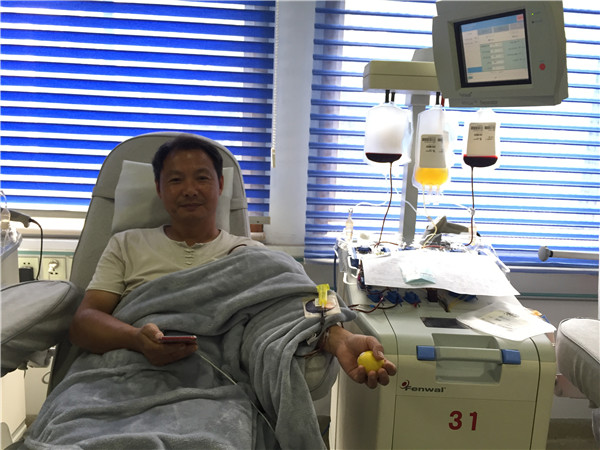 早在十多天前,汪光辉同志就和机采科同事预约了献板。8月19日是星期天,休息日的一大早他特地从家中赶到中心一楼的体检大厅,和其他献血者一样取号,排队体检、初筛,经过一系列的检测合格后,他成功捐献了两个治疗量的血小板。