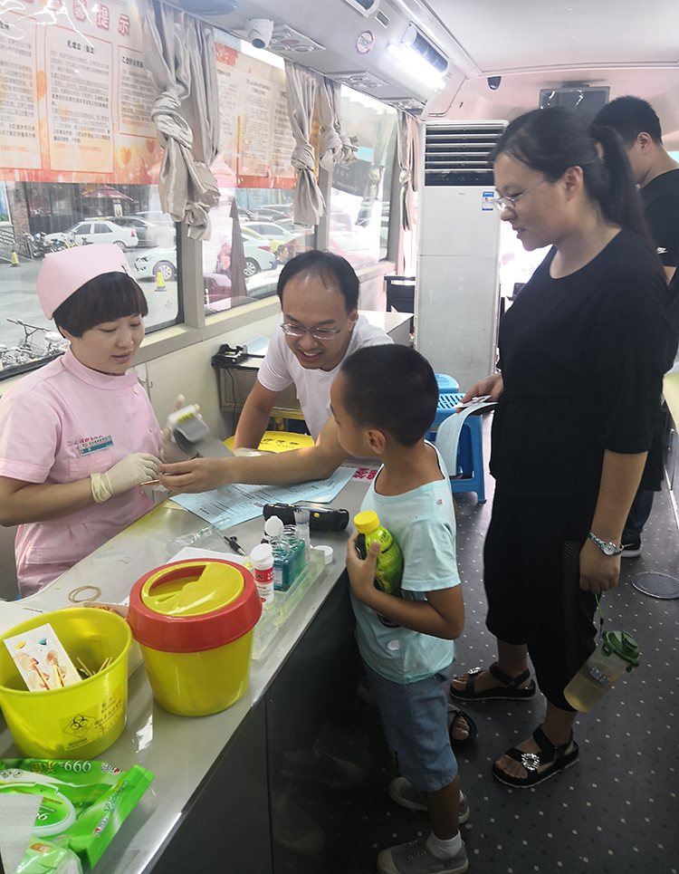 北人集团的爱心行动也吸引不少热心市民参与进来。“我可以献血吗?”一名男子走上车问道,紧跟着的是他的妻子和儿子。经询问,他是从北国超市得知会有采血车过来,带着家人专程过来献血的。男子名叫苏永亮,就住在附近,他的父亲献血多年,自己却没有献过一次血。“我知道河北省博物院那有个献血屋,但因为各种原因一直没有去过,这次采血车开到了家门口,就带着妻子和儿子专门过来献血。”苏永亮说。身体检查合格后,他和妻子每人献血200ml。“第一次献血先抽200ml,没什么不适的话下次再献400ml”。