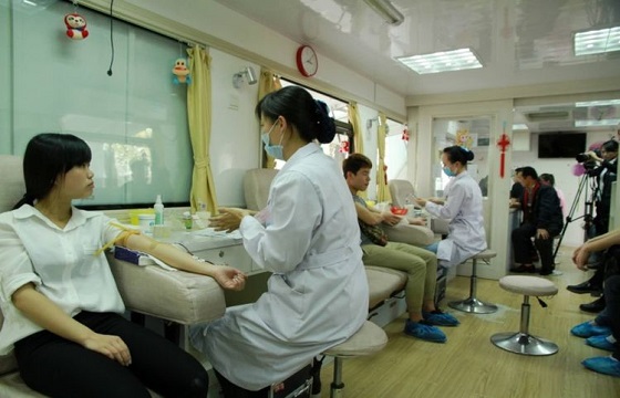 首先,我同妈妈一同踏上漂亮而专业的献血房车。献血房车宽敞、舒适,身着白大褂的护士阿姨介绍房车内还有医用空气消毒机、冷暖空调、液晶电视、冰箱等设备呢,真有点高大上的感觉。护士阿姨向我讲解了献血流程,包括填表-体检-验血-采血四个环节。而后有爱心的叔叔阿姨们纷纷走上献血车,体检合格后勇敢地撸起袖子,护士阿姨将一袋袋殷红的血液采集到血袋,包装后放进储血冰箱。