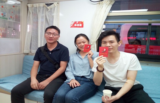 9月11日下午,位于南昌市火车站西广场的采血点,迎面走来几位青年,领头青年快步走上前,拿出一本献血证。“我来献血,这是上次的献血证。”而后在工作人员的引导下,他与其随行的同伴一起认真地进行着献血征询登记。他们均是南昌铁路局客运段的工作人员。领头那位叫魏少鹏,早在12年就献过血,其后也陆续献过几次。“我其实很害怕打针,但看到周围许多同事都献过血,也经常听他们说献血不但有利于身体健康,而且还能帮助用血的病人。也想做点儿力所能及的事儿吧,所以就随他们一道来了。”一旁填表的姚梦佳女士略带紧张地说着。经过一系列的体检化验合格后,他们都纷纷献血400ML。