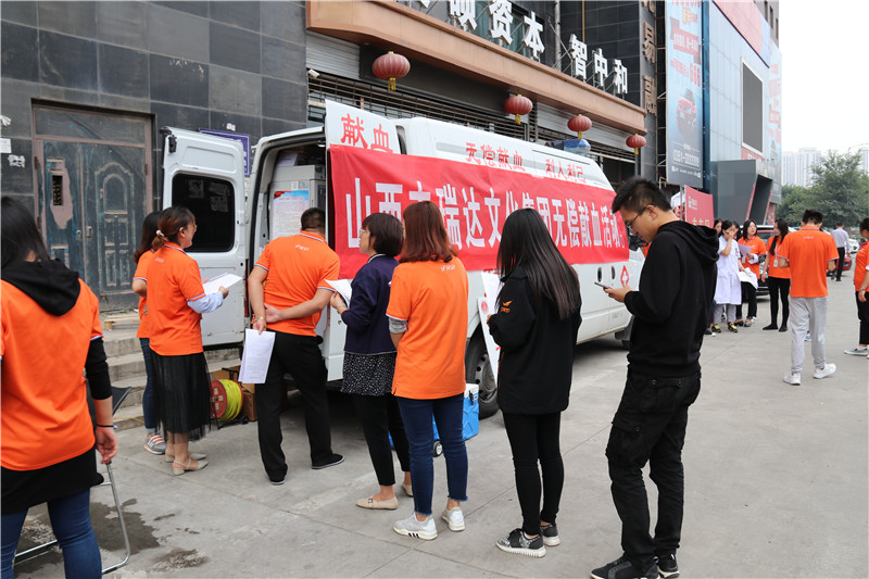 近日来,太原市血液库存量已低于警戒线,尤其是O型血液告急。山西丰瑞达文化集团得知此消息积极联系我中心于2018年9月10日组织全体员工开展无偿献血活动。