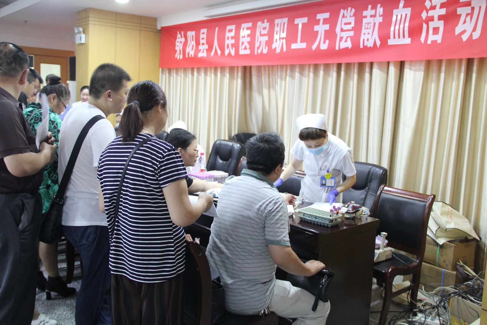 为大力弘扬医务人员“仁爱、人道、奉献、和谐”的无私奉献精神,盐城市射阳县人民院医院于9月12日组织开展无偿献血活动。医院领导班子给予高度重视,精心安排,广泛宣传动员,全院职工积极响应。早上7点半刚到,院领导班子、各科室主任、护士长及职工纷纷赶来参加无偿献血。