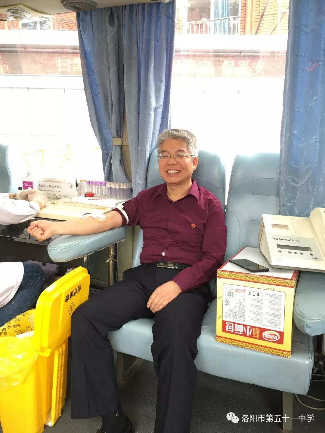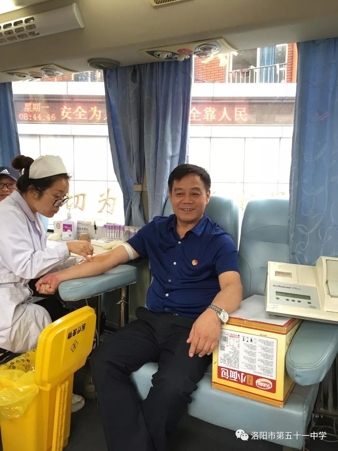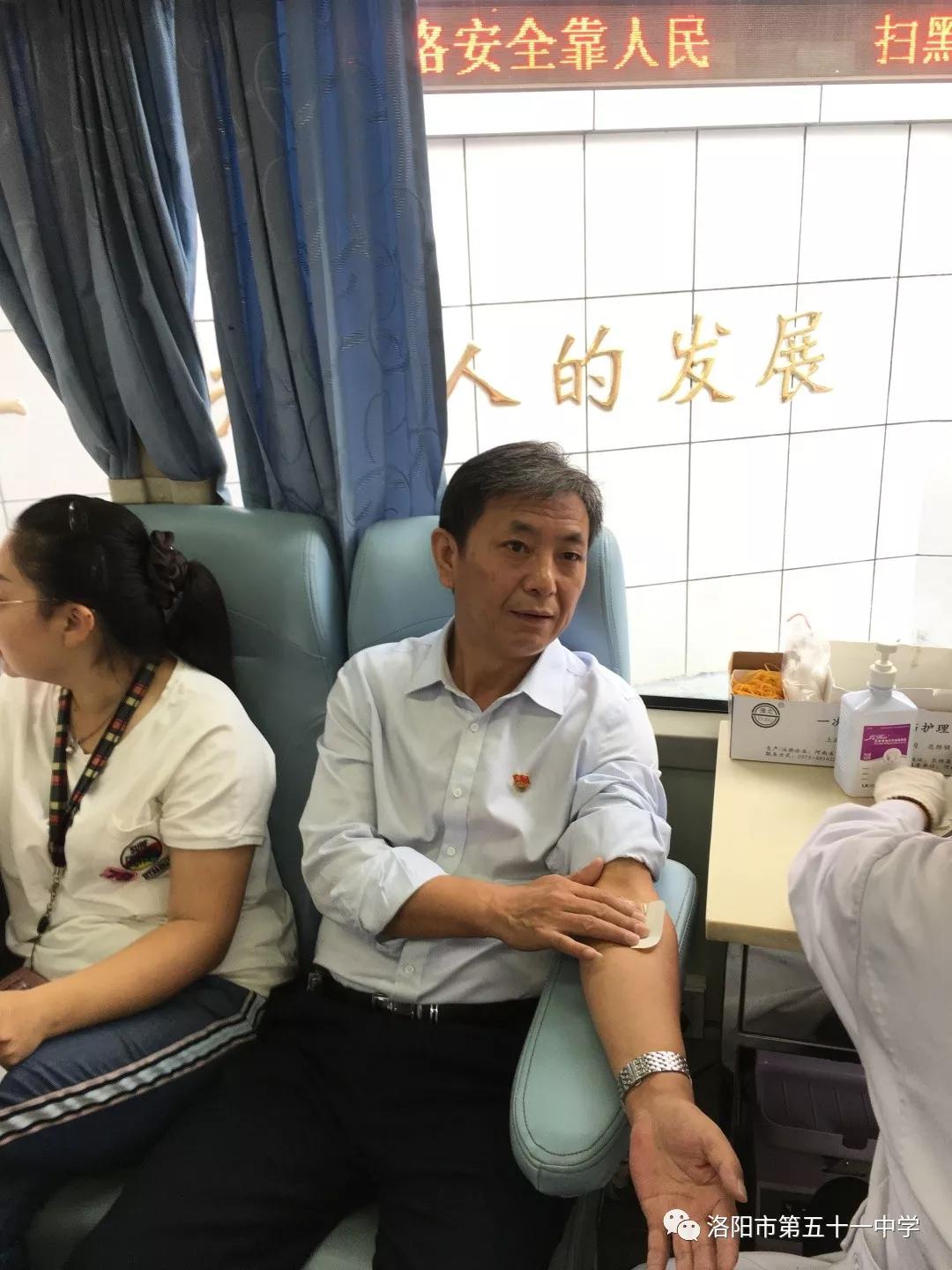 上午八点,洛阳市中心血站将流动采血车开进五十一中的校园,校长张良、党支部书记汤长立、副校长李世宽等纷纷带头走上采血流动车,撸袖献血。教师们利用下课间隙,也纷纷来到采血现场,有序地在血站医护人员指导下认真填写《无偿献血登记表》、验血型、抽血检测,在专业采血员的安排下进行献血。