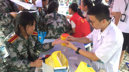 在高校团体采血的时候,高校红十字会对无偿献血工作非常支持。在招新前,体采科工作人员分别利用微信群与扬大红十字会及南邮通达学院进行沟通,希望在招新的时候加入无偿献血知识的宣传,另外还可以利用免费检测血型的方式吸引学生加入校红十字会。9月18日,市中心血站工作人员前往南邮通达学院招新现场,给学生免费检测血型,现场发放无偿献血宣传资料。当天不仅仅吸引了很多身穿军训服的新生,还有一些学姐学长们前来测试血型,并且申请加入了校红十字会社团。据校红十字会负责人介绍,原本计划招新35人,谁知就中午短短2个小时,报名人数就超过了40人。