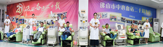 打造团队,凝聚力量——是佛山市中心血站二十年发展的核心要素。佛山市中心血站通过文体活动,增强团队的凝聚力;通过培训,增强团队的战斗力;通过爱心传承,增强团队的号召力。现在佛山市中心血站业务团队,服务至上技术精湛,科研团队,潜心钻研成果丰硕,志愿服务团队,传递爱心无怨无悔。我站技术骨干研发的全自动贴标机获得了二项国家发明专利并已投入实际应用,我站研发的自动冷沉淀制备仪也已投入生产。我站员工20年来共有743人次参与献血,其中献血全血406人次,献机采血小板337人次,献血总量达202170毫升,全站共有112人次荣获全国、省、市无偿献血奉献奖。