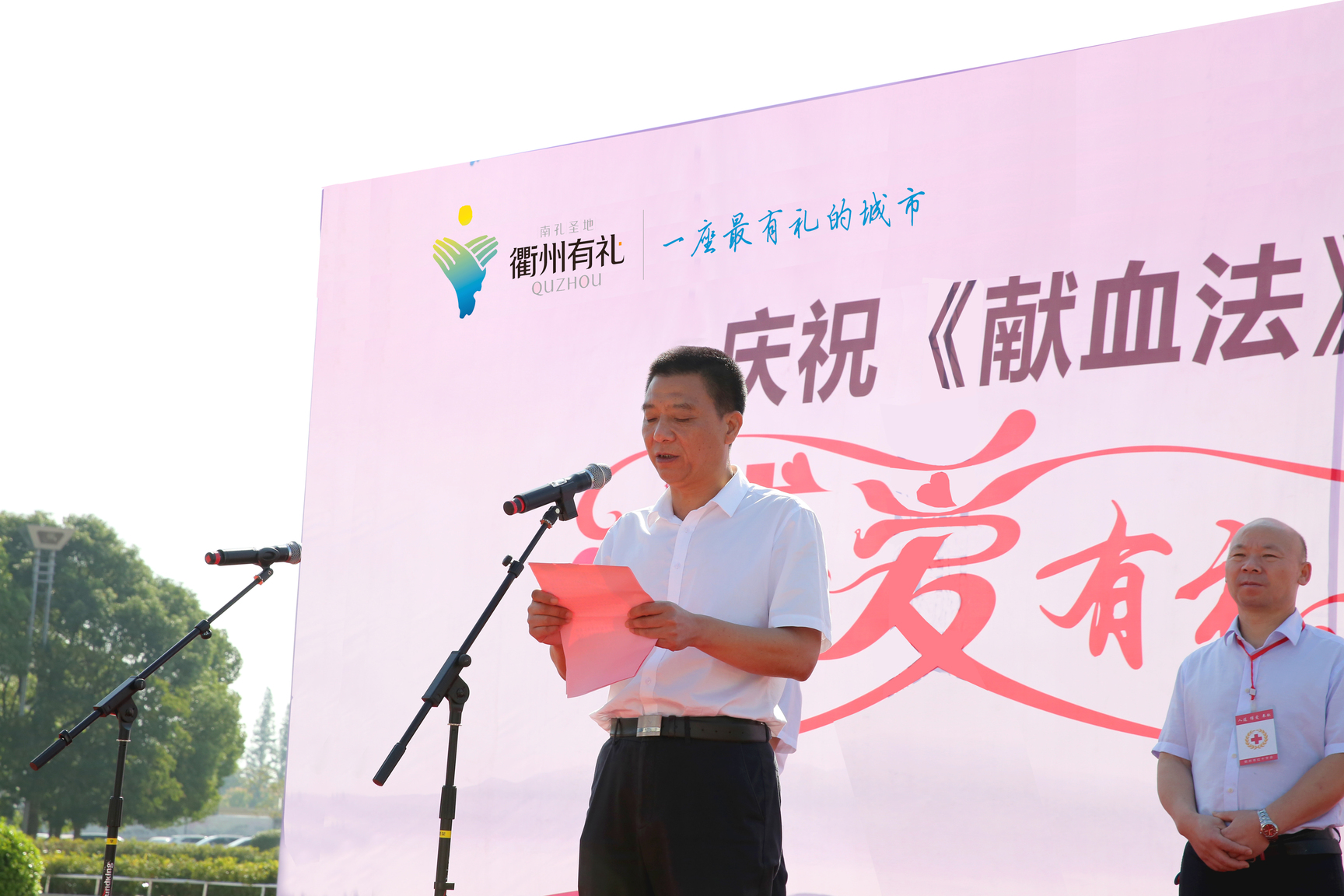 三是市无偿献血志愿者服务队队长吴国忠作“助力献血,你我同行”志愿者宣誓:让我们以履行公民义务为光荣,本着社会共济、关爱他人的精神,做无偿献血行动的积极响应者,用我们的浓浓热血、拳拳爱心去营造一个充满“人道、博爱、奉献”精神的有礼衢州!欢迎您加入到光荣的无偿献血志愿者行列中来!愿好人一生平安!
