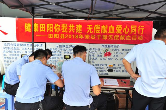 与朝阳同行。28日上午,伴随着第一缕阳光,百色市中心血站的捐血车停靠在布洛陀广场,然而,同样追赶时间的还有直属机关工委及各部门的献血者们,活动开始后,相关人员立即投入工作,田阳县直属工委的农建平副书记和黄延琪副书记更是亲自充当起了志愿者,指导献血人员进行填表登记,人群之中,几位帅哥民警着急的注视着自己正在献血的同伴,经询问得知,他们公务在身,可又担心来不及圆上自己的献血梦,为此,工作人员合理安排,及时调配,为这些赤诚之士开出了属于爱心的绿色通道。