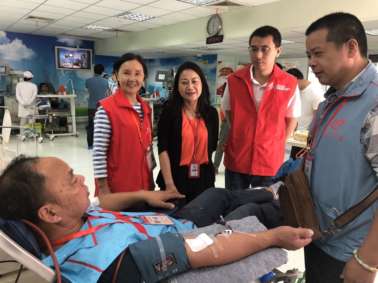 中心副主任、中心无偿献血志愿者服务总队队长张晰,采供血部部长、中心无偿献血志愿者服务总队副队长章怿慰问正在献血的“红色力量”队长郑世明
