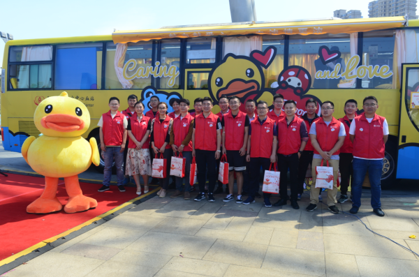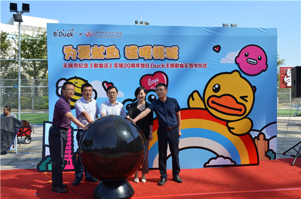 “为爱献血 温暖锡城”无锡市纪念《献血法》实施20周年暨B.Duck主题献血车首发仪式于10月1日上午10:00在万象城正式举行。无锡市公民献血领导小组办公室主任、无锡市卫生和计划生育委员会副调研员胡建伟,B.Duck品牌总监黄亚辛,无锡市卫生和计划生育委员会医政处处长李明刚,无锡市红十字中心血站站长殷崎涛,站党委书记王强等出席首发仪式。胡建伟主任代表市公民献血领导小组向大家介绍了20年来我市无偿献血事业取得的进展,感谢社会各界和广大市民关心和支持无偿献血事业,并希望更多健康适龄公民秉着 “奉献、友爱、进步、互助”公益理念,共同为爱举手、为生命加油!