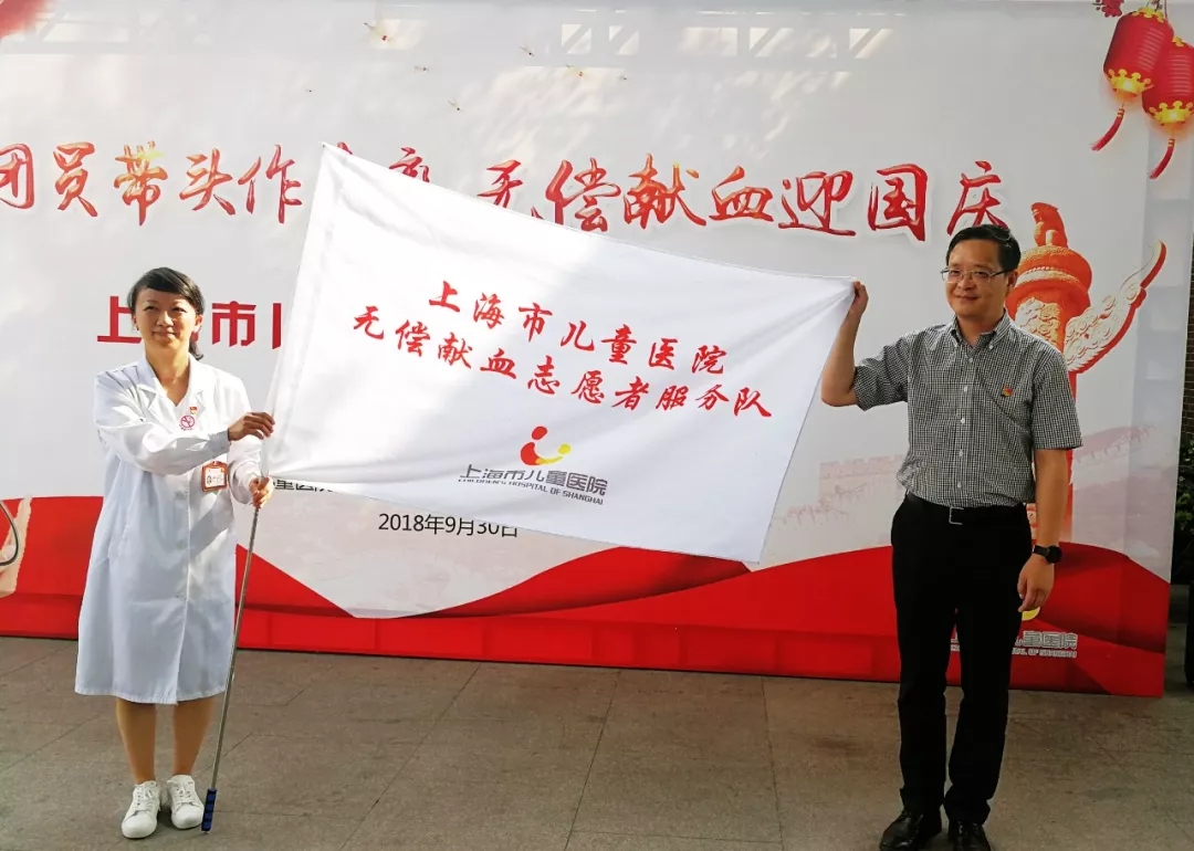上海市儿童医院内二支部书记、血液科副主任邵静波代表医院无偿献血志愿者服务队接受上海市血液中心党委书记、上海市血液管理办公室主任邹峥嵘授旗