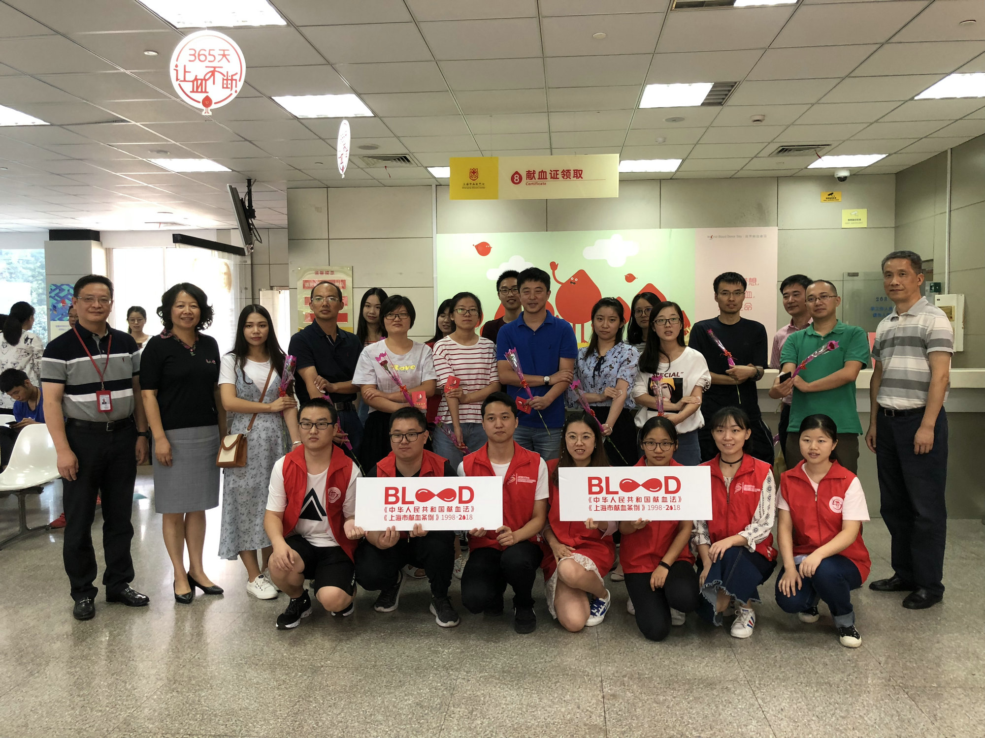 上海交通大学医学院党委副书记、纪委书记施建蓉,上海市血液中心党委书记、上海市血液管理办公室主任邹峥嵘,上海市血液管理办公室副主任陈强与献血者合影