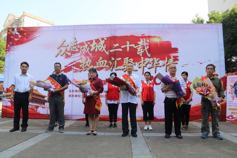 20年,无偿献血,你我同行。活动现场对黄志明、聂斌、张锦洪、莫小红、郭战标等五位热心无偿献血者代表进行了赠送鲜花致以感谢,他们持之以恒,热心公益,捐献热血,传递人间真爱。20年的坚持,把一件平常的事情,做到不平凡。作为献血者代表,梧州市第二人民医院护师莫小红也分享了自己的献血故事。她从1999年4月23日开始献血,从第一次的献200毫升,到近年每半年就献400毫升,至今已经19年了,献血总量达到7800毫升,曾获全国无偿献血奉献奖铜奖和银奖。她说:“我献血的初衷一开始很简单,就是救死扶伤,这曾经也被一些亲人朋友所不理解,但随着时间的推移,身边越来越多的人加入到无偿献血的队伍里,当我的血液输入到受血者的身体里时,感恩和奉献的精神在传递着,我感到无比自豪、无尚光荣。”