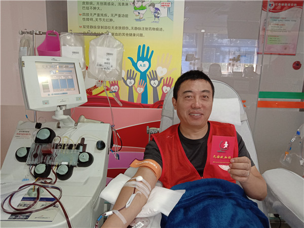 10月3日上午,江苏省血液中心机采科出现了一位熟悉的面孔——无偿献血宣传服务志愿者吴双云。吴双云之前因为体型偏胖,2001年在医生的建议下开始无偿献血,2017年10月第一次尝试捐献血小板,18年间累计捐献全血2800毫升,血小板36治疗量,刚好总计一万毫升。每次见到他都是满面笑容,自带喜感,自己献血小板的同时还会不停的和献血者聊天,放松他们的心情。在捐献血小板的过程中,吴双云看到穿红马甲的志愿者,萌生出加入无偿献血宣传服务志愿者的意愿。他想到做到,2011年11月,他报名参加培训后成为了一名无偿献血志愿服务志愿者。从此以后,无论是需要O型血,还是需要无偿献血宣传、招募服务,一个电话,他立即随叫随到,从江北浦口赶到中心的各个献血点,他总是说:“我是自由职业者,有需要尽管给我打电话!” 短短几年,他把自己的业余时间都用来做志愿服务,至今已经服务了500多小时。