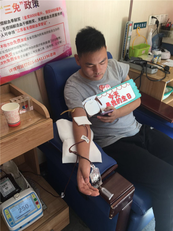 进过一系列征询、体检、初筛的过程,他成功的捐献了300ml全血,在献血的过程中何栓龙说:“我早就想献血了,可是年龄一直不够,今天正好国庆节有时间,赶上我的生日这天,终于可以献血了!”小伙子的话虽然很朴实,但是充分体现了他是一个富有爱心的人。而在国庆节用参加无偿献血来庆祝生日也是一件很有意义的事!希望有更多有爱心的年轻人加入到无偿献血的行列,壮大我们的无偿献血队伍!!!