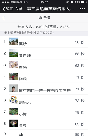 为期2周的献血知识答题竞赛,共有840人参加比赛,浏览量达5万多次。每位参赛者从题库中随机抽取20到题作答,根据答题正确率和作答时间进行排名,将全部回答正确且耗时最短的前30名参赛者评选为无偿献血传播大使。试题设计灵活,部分题目难度较高,所有参赛者中仅71人得满分。但是,依然有部分参赛者答题又快又准,第一名仅耗时56秒。