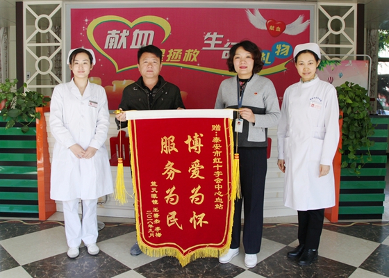 10月19日上午,泰安市岱岳区马庄镇南苏村李成文老人的家属,满怀感激地将一面印有“博爱为怀,服务为民”的锦旗送到市中心血站副站长张萌手中。