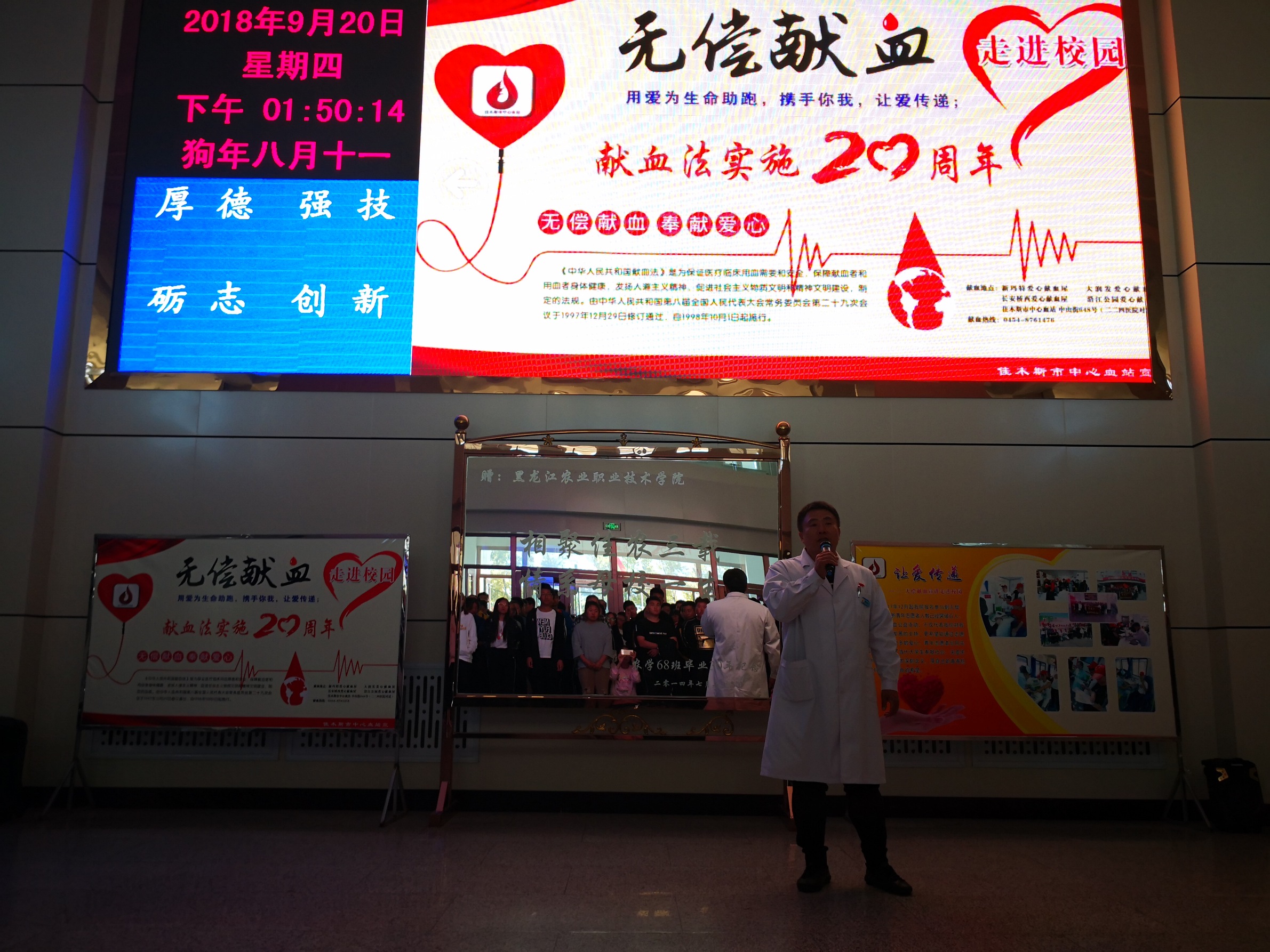 为纪念《中华人民共和国献血法》颁布实施20周年,9月20日,应黑龙江省农业职业技术学院团委邀请,市中心血站宣讲团到学院为2018届新生进行题为“用爱为生命助跑,携手你我,让爱传递”的无偿献血宣讲,活动由学院团委组织。