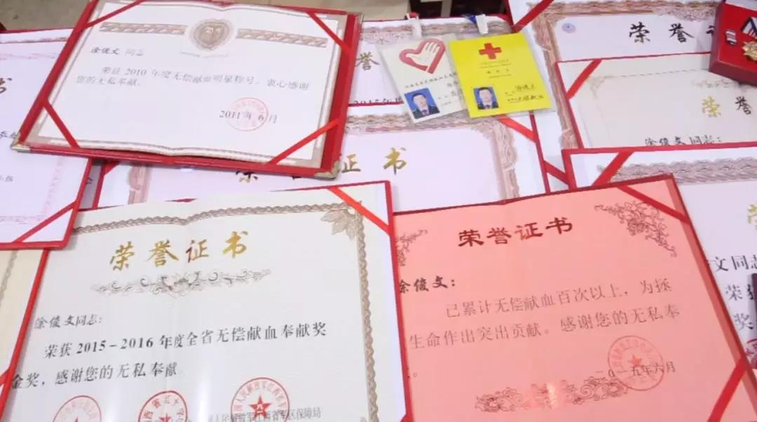 因为无偿献血和志愿服务,涂俊文获得的奖章、荣誉证书不计其数。面对一些人的质疑,他很淡定:坚持献血只是做了自己想做的事。对涂俊文而言,献血和他的工作一样,都是在守护生命,在这个过程中,他是无比快乐的。