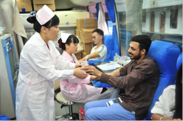这是一名外国留学生,从咨询到填表,他始终没有过多的言语和表情,献血车上,这位浓眉大眼的年轻人似乎稍显紧张,他指着身旁的牛奶,小心翼翼的询问起采血护士:“你好,请问,我能喝这个吗?”“当然可以”采血护士微笑着将插好吸管的牛奶递给了他,我们的镜头始终跟随着这位羞涩的大男孩,正在献血的他似乎发现了摄影师的存在,令人诧异的是,他并不像以往镜头前的外国友人那么活泼外向,只见他立刻收起手机,挺了挺腰杆,正襟危坐的好似正在迎检的卫兵,当照相机放下的瞬间,面对摄影师,看似木然的他露出了温暖的微笑。人们跨越了万水千山只为消除障碍、寻找共鸣,而这一袋袋异国的基因密码,却让每个心灵的彼岸紧紧相连。