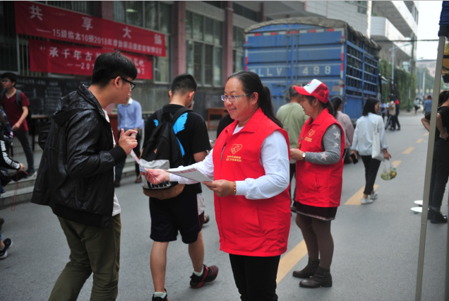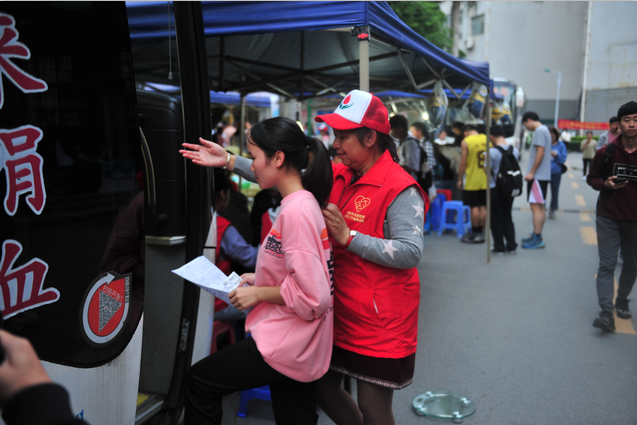 人群之中,两团“火焰”在来回穿梭,她们是百色市中心血站退休职工邹碧梅及其同胞姊妹邹碧园,得知今天是高校献血的大日子,两位老同志穿着志愿者工作服早早来到了现场,“发放传单,引导服务”,“退休不褪色”的精神被发挥的淋漓尽致,在对话中她们如是说到“我们虽然退休了,但还是享受和年轻人一起奉献的感觉”。落日的余晖不仅染红了天,更托起了明朝的旭日。
