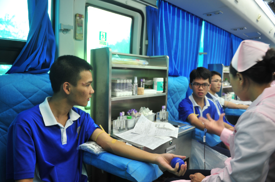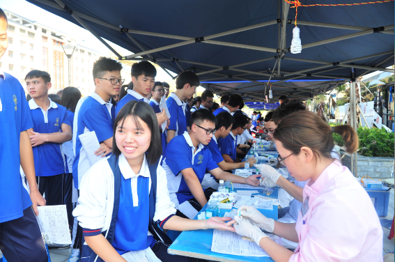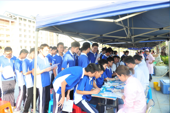 10月31日下午,随着下课铃声的响起,献血活动如约而至,“整齐”——是我们对这所名校的第一印象,清一色的蓝衣校服,严格的半军事化管理,使得活动的进行井然有序,然而繁重的课业无法磨灭同学们心中的热情,手拿献血表的他们探头探脑的张望着眼前的同伴,满脸的期待与紧张,他们严谨而乐观,高强度的学习使得他们在献血过程中往往不苟言笑,然而,天性开朗的花样年华还是没能抵挡住工作人员幽默的话语;蔚蓝的海平面上,一轮红日格外耀眼,他们是百色市无偿献血志愿者服务队的志愿者,他们来自各行各业, 面对着众多学子,这些红衣天使迸发出了年轻时的热情,站在他们眼前的,不再只是孩子晚辈,更是由殷红的热血联结而成的“忘年交”;“对知识的贪婪”已然成为了这座学校的代名词,捐血车上,两名正在献血的男同学争相询问起了献血知识,这一幕,采血护士显然也喜闻乐见,耐心的做起了讲解老师,同学那求知的眼神让人恍然大悟,名校之“名”,并不在于多么优秀的师资条件或办学设备,而是得益于这融入骨髓的文化内涵。