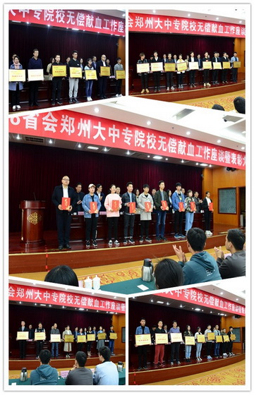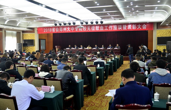 为发挥青年大学生的献血主力军作用,促进省会郑州无偿献血工作,2018年10月27日上午,2018年省会郑州大中专院校无偿献血座谈暨表彰大会在紫荆山宾馆召开,本次活动由郑州市公民献血委员会办公室和河南省红十字血液中心共同举办,是省血液中心纪念《献血法》实施20周年系列活动之一。共青团河南省委社会联络部部长李山英、省教育厅体育卫生艺术处副处长高根立,省卫生计生委医政医管处调研员、省医疗服务指导中心主任董薇,省直团工委副书记郭淑萍,以及来自郑州大学、河南财经政法大学、河南职业技术学院等驻郑80余所大中专院校负责无偿血工作的领导、老师和学生共计200余人参加了会议。