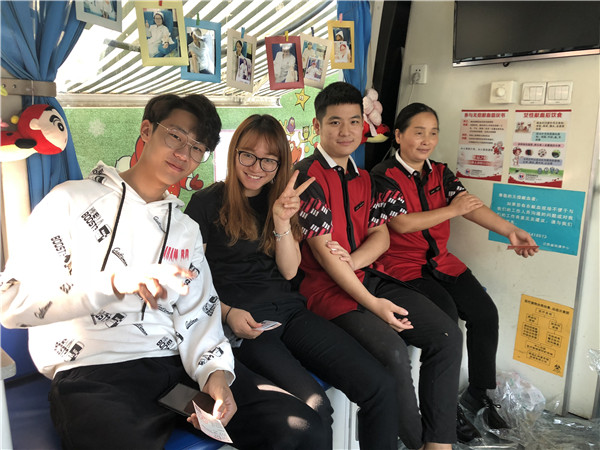 这时四位穿着肯德基员工制服的俊男美女走上献血车,原来他们因为停电停业了,其中一位叫倪加宁的姑娘便号召大家来献血,与孙宇轩,王素侠,沈冲四位一起组团来献血,倪加宁第一个成功献血300ml,00后的孙宇轩是大一新生,利用课余时间来肯德基做兼职,也顺利献血300毫升,王素侠一直想献血,女儿一直积极参与无偿献血,这次有机会与同事一起来奉献爱心,献血300ml,献完一直在说下次一定献四百。沈冲在学校就开始参加无偿献血,这次也献了400ml热血。在此号召大家献血有益健康,在您有一点时间,身体健康的时候奉献一点爱心,世界会因此而美好。