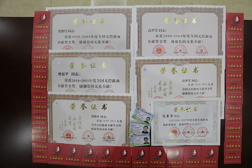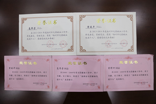 就这样,一家三口开始了献血之路,不论刮风下雨,不论事情多忙,只要接到血站需要献血的电话,就会抽出时间毅然前往血站献血。每年春节由于广大市民都忙于探亲度假,献血者很难招募,但是他们都提前预留出一天赶往血站献血,以去帮助那些春节期间还在住院的患者。他们不但自己献血,更是带动周围的朋友参与进来,向他们宣传无偿献血。谢孝忠是夫妻俩的一位朋友,在他们的带领下也获得了全国无偿献血奉献金奖。儿子曾延平工作于扬州市邗江区陈俊学校,是一位体育老师,他会主动向同事宣传无偿献血,同时也会向学生讲解无偿献血这一公益事业,周围的同事也都陆续加入无偿献血队伍中来。
