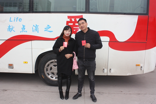 无偿献血救生命,怀揣大爱回家乡。想到回乡创业的美好前景,郭永刚和爱人王宁商定,一块来县城采血点一起献血奉献爱心,祝愿回乡创业顺利成功。夫妻俩都是A型血,在采血车前,带着鲜红的献血证合影留念,脸上开满了幸福的花儿。