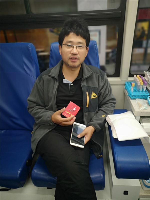 11月6日,江苏省血液中心江宁献血车迎来了一位“老”献血者,他叫邵晓斌,是南京市秦淮中学的一名老师,今天是他第三十次献血,总计献血量10900ml。和他聊天得知他是从2000年开始参加无偿献血的,每年献一次,每次200ml,从2003年开始就一年两次,每次400ml,而且还拿到过无偿献血奉献奖铜奖、银奖和金奖的证书,去年还拿到了“江苏省无偿献血荣誉证”,他很开心自己的血救了那么多人同时自己也得到了“回报”。