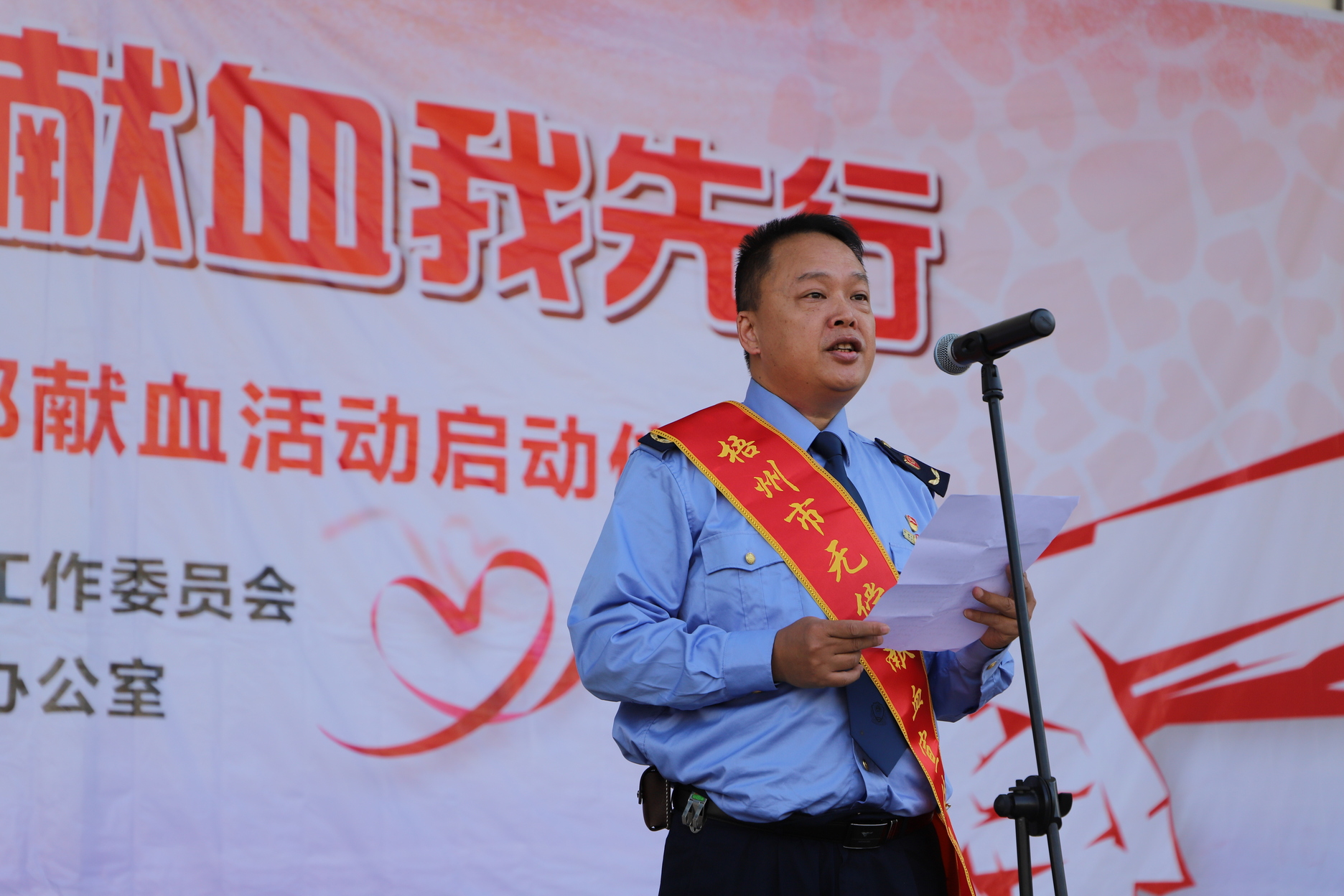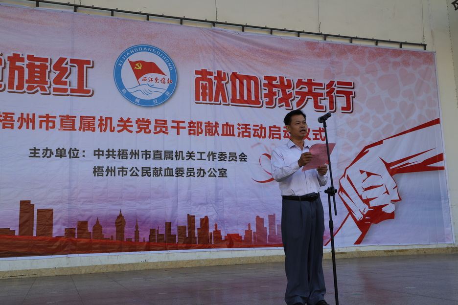 在启动仪式上,梧州市卫生计生委党组成员、副主任陈贻德同志致辞:活动的举行,旨在全市树立党员干部热心公益、乐于奉献、情系百姓的正面形象,为我市“四城联创”工作添砖加瓦。《中华人民共和国献血法》自1998年10月1日颁布实施至今20年以来,我市无偿献血工作得到了全市各级各部门的大力支持与积极参与,多次组织机关团体、企事业单位的团体无偿献血活动,特别是市委、市人大、市政府、市政协、市检察院、市教育局、市卫生计生委等一大批热心公益的机关党组织,积极组织发动党员干部职工参加无偿献血,发挥党员的先锋模范作用,引领社会各界的广泛支持和积极参与,为人民群众、为社会树立了榜样,取得了良好的社会效应。同时,陈副主任指出,目前我市的临床用血还是很紧张,每天至少需要200人献血才能满足临床用血的需求。希望国家工作人员作为公民道德和行为规范的楷模,继续率先献血,为树立社会新风尚作表率。并向各位救死扶伤的践行者和文明创建的示范者表示崇高的敬意和衷心的感谢!