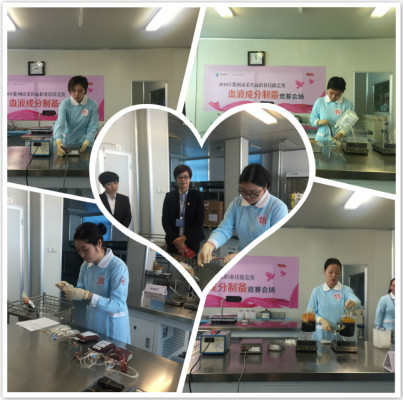 在血液成分制备竞赛现场,待制备血液准备完毕、相关设备准备就绪。早上7时50分,选手们按照抽签号依次由后勤人员引导入场。只见她们认真检查各种仪器设备,领取血液、装杯、离心、分浆、入库,所有动作一气呵成,一袋袋制备合格的血浆和悬浮红细胞是选手们比赛成绩最好的见证。
