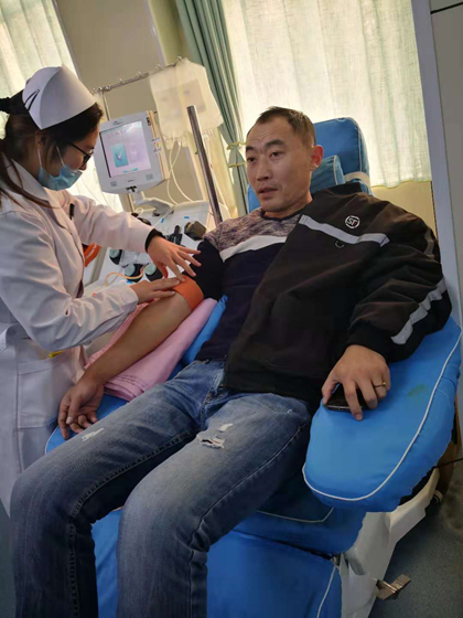 顺丰速运快递小哥杨勇正在捐献机采血小板(王峰 摄影)