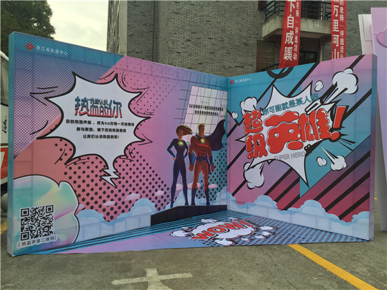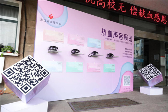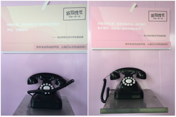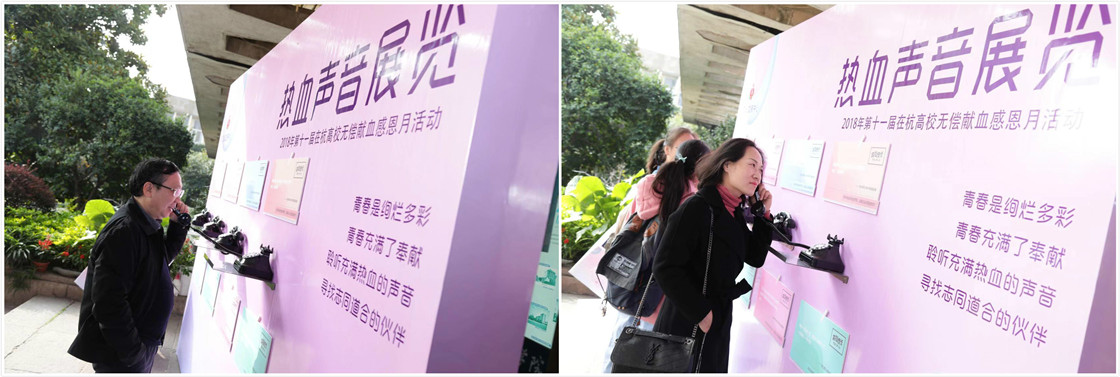 在活动现场,有一个“热血情书”展示区,每一份情书配有一个听筒,拿起听筒,即可聆听自社会和大学生对无偿献血的,或轻柔或认真的深情告白。这个活动已制成H5页面,感兴趣的朋友现场即可参与,参与者扫描二维码将自己的声音录制音频上传以后,生成自己的二维码,可现场打印出来,亲手粘贴在展示区,也可以发到朋友圈,让更多朋友聆听你专属的“热血声音情书”,认识热血的你。