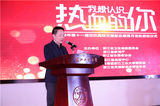 11月20日下午,“我想认识热血的你——2018年第十一届在杭高校感恩月无偿献血活动启动仪式在浙江工业大学朝晖校区举行。省卫生健康委巡视员马伟杭,浙江工业大学副校长华尔天,省卫生健康委医政医管处处长俞新乐,省血液中心主任、省输血协会理事长胡伟,省血液中心党委书记、省无偿献血志愿者协会会长陆新成,省血液中心副主任徐健,浙江工业大学团委书记陈耀等领导出席。来自浙江大学、杭州师范大学、浙江理工大学等在杭30余所高校,共计150余名师生代表参加。
