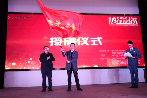 仪式上,省卫生健康委巡视员马伟杭为浙江工业大学授“热血先锋”旗帜。省卫生健康委巡视员马伟杭,浙江工业大学副校长华尔天,省卫生健康委医政医管处处长俞新乐,省血液中心主任、省输血协会理事长胡伟,省血液中心党委书记、省无偿献血志愿者协会会长陆新成,省血液中心副主任徐健、浙江工业大学团委书记陈耀等领导为所有参与感恩月献血活动的高校颁发“在杭高校感恩月无偿献血活动10周年纪念”奖牌。