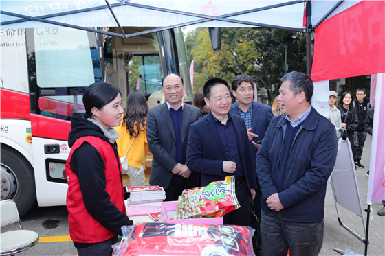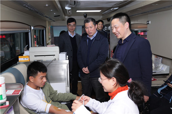 献血活动现场,浙江工业大学副校长华尔天,省卫生健康委医政医管处处长俞新乐,省血液中心主任、省输血协会理事长胡伟,省血液中心党委书记、省无偿献血志愿者协会会长陆新成等一行几位领导,向献血车上的学生献血者们和献血车旁的学生志愿者们表示慰问和感谢。